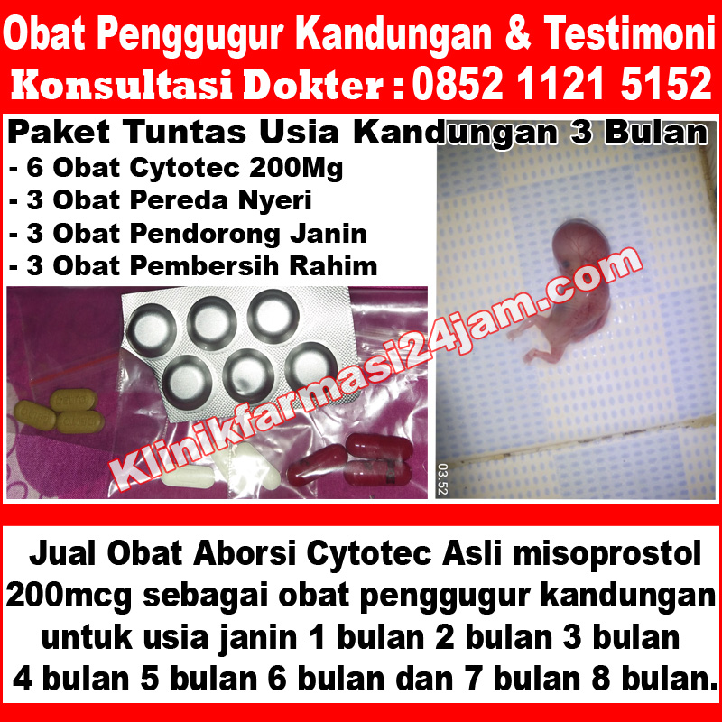 - Paket 3 Bulan : 6 Cytotec + 3 Pendorong Janin + 3 Pereda Nyeri + 3 Pembersih Rahim.