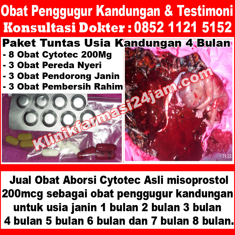 - Paket 4 Bulan : 8 Cytotec + 3 Pendorong Janin + 3 Pereda Nyeri + 3 Pembersih Rahim.