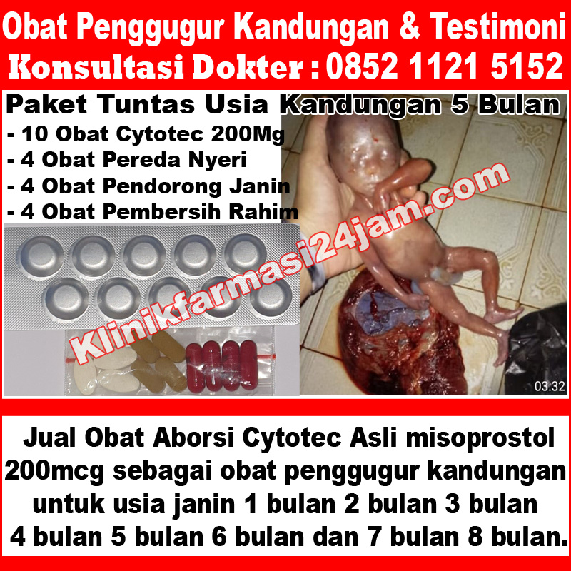 - Paket 5 Bulan : 10 Cytotec + 4 Pendorong Janin + 4 Pereda Nyeri + 4 Pembersih Rahim.